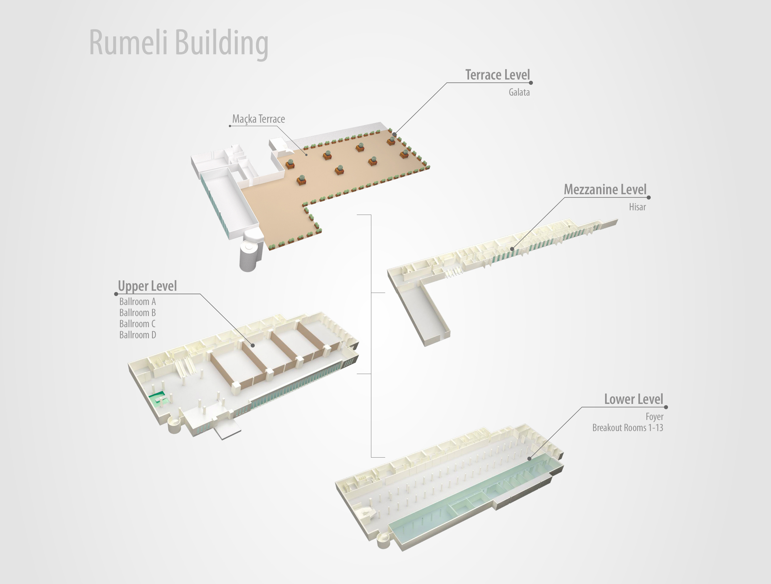 Rumeli Upper Level is a unique event venue for large-scale meetings, summits, weddings, galas, fairs, and exhibitions, providing a high-ceilinged interior, a column-free structure, easy access, and natural lighting. The hall has all the technical equipment required for various events. Rumeli Upper Level can be divided into four column-free sections (A, B, C, D) in a ballroom layout and can host massive banquets with its total area of 4,000 m².